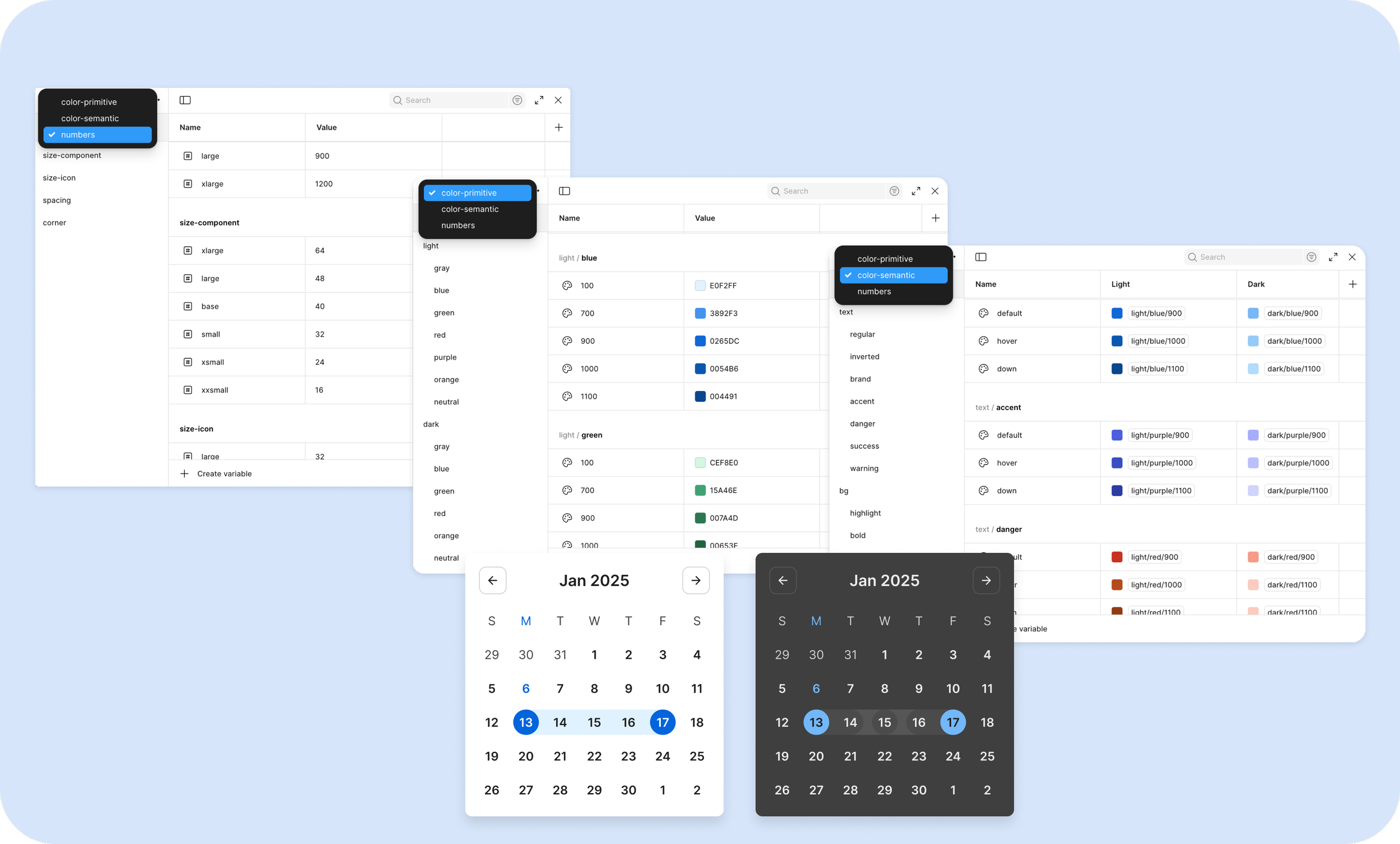 Semantic colors and values are defined as tokens using Figma Variables, ensuring consistency across designs and alignment with developer implementation.